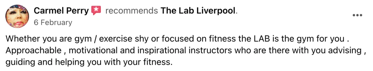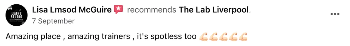 "The Lab is definitely a hidden gem of Liverpool, a great place to train with helpful and welcoming trainers! I spent 4 months doing the group PT and it was lovely, effective workouts and more affordable than 1 on 1 training. 10/10 would recommend." - Nicole